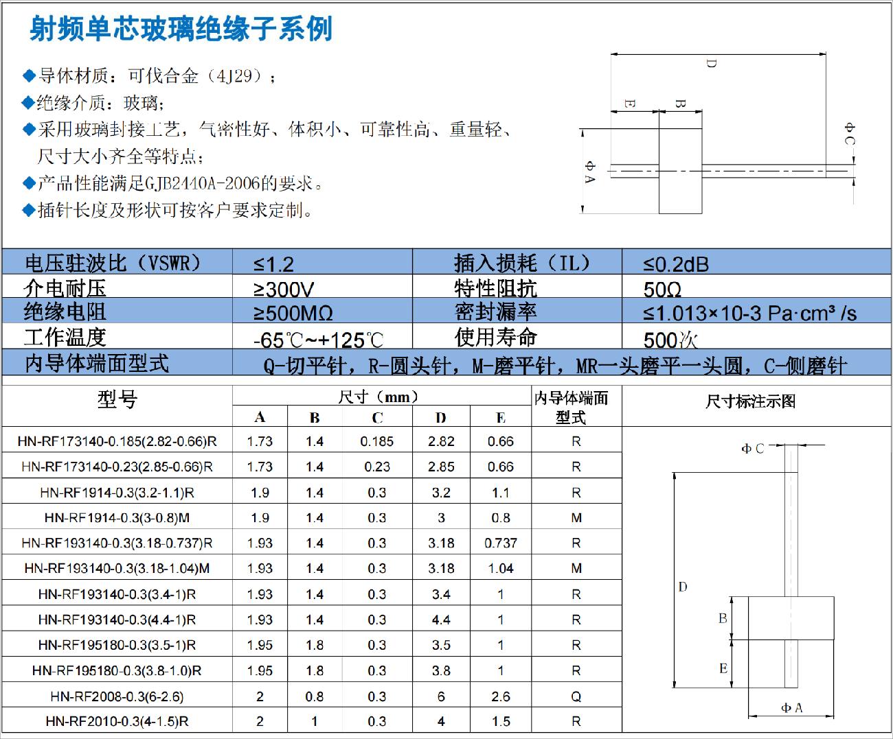 產(chǎn)品描述:頻率范圍:DC-67GHz 駐波比:≤1.2 插入損耗:≤0.2dB 特性阻抗:50Ω 介質(zhì)耐壓≥300V 絕緣電阻≥1000MΩ 密封漏≤1.013×10-3 Pa·cm3 /s(He) 工作溫度:-65℃~+155℃ 導(dǎo)體外徑、高度及插針的直徑、形狀和長(zhǎng)度均可按客戶要求定制