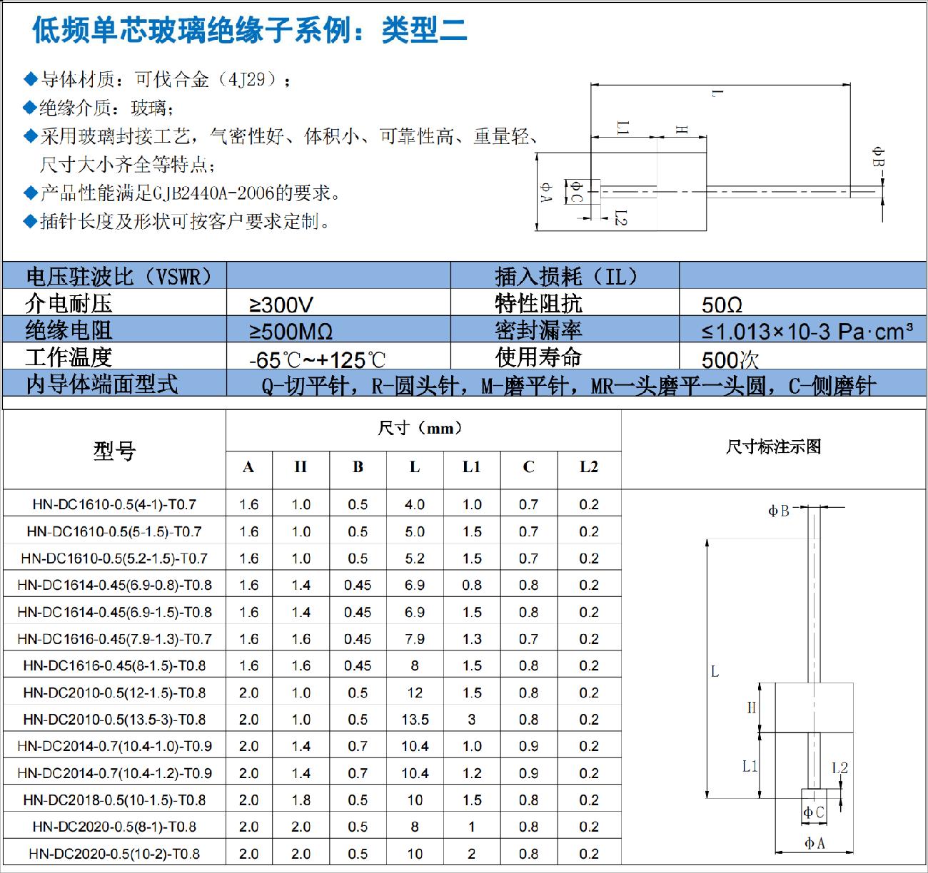 產(chǎn)品描述:介質(zhì)耐壓≥300V 絕緣電阻≥5000MΩ@500V 密封漏率:≤1.013×10-3 Pa·cm3 /s 工作溫度:-65℃~+155℃ 導(dǎo)體外徑、高度及插針的直徑、形狀和長度均可按客戶要求定制