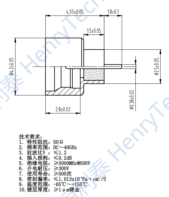 產(chǎn)品描述:頻率范圍:DC-40GHz 駐波:≤1.2 半擒縱 介質(zhì)耐壓≥500V 絕緣電阻≥5000MΩ@500V 密封漏率:1.013x10-3Pa·cm3 /S(He) 工作溫度:-65℃~+155℃ 導(dǎo)體外徑、高度及插針的直徑、形狀和長(zhǎng)度均可按客戶(hù)要求定制