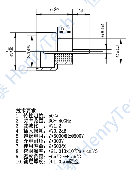 產(chǎn)品描述:頻率范圍:DC-40GHz 駐波≤1.2 光孔 介質耐壓≥500V 絕緣電阻≥5000MΩ@500V 密封漏率:1.013x10-3Pa·cm3 /S(He) 工作溫度:-65℃~+155℃ 導體外徑、高度及插針的直徑、形狀和長度均可按客戶要求定制