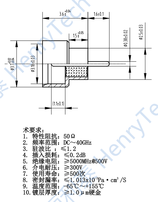 產(chǎn)品描述:頻率范圍:DC-40GHz 駐波≤1.2 光孔 介質(zhì)耐壓≥500V 絕緣電阻≥5000MΩ@500V 密封漏率:1.013x10-3Pa·cm3 /S(He) 工作溫度:-65℃~+155℃ 導體外徑、高度及插針的直徑、形狀和長度均可按客戶要求定制