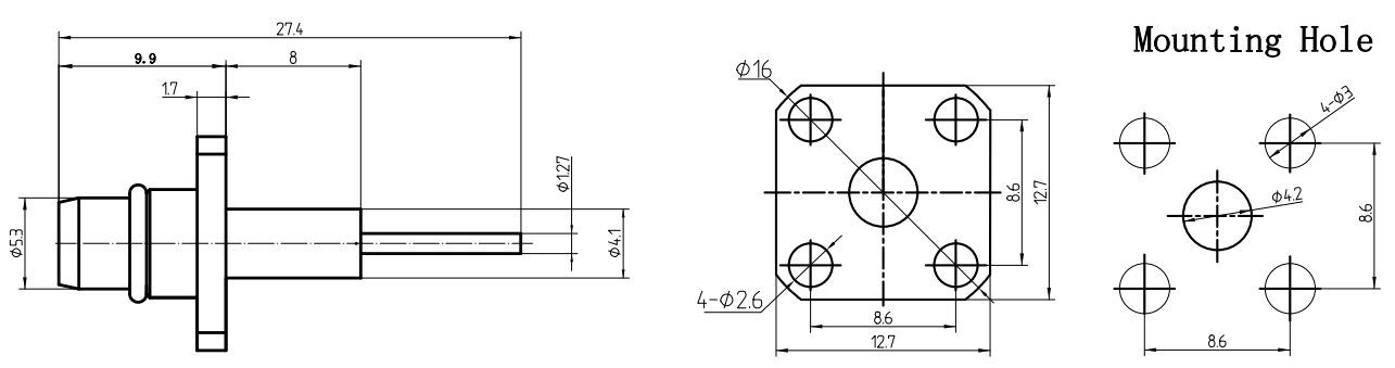 替代型號:BMA公頭4孔法蘭安裝不銹鋼連接 DC-6GHz 阻抗:50Ω 駐波比≤1.25
